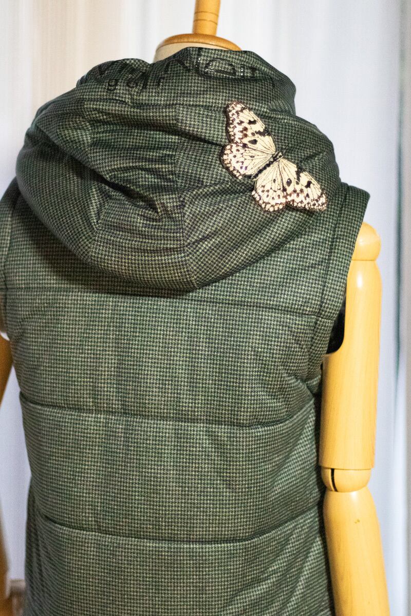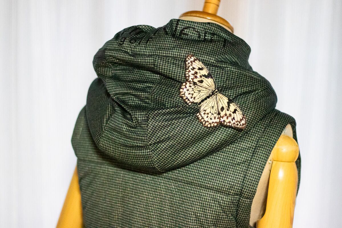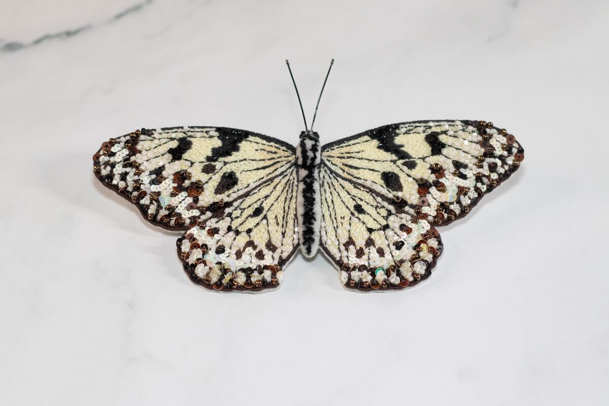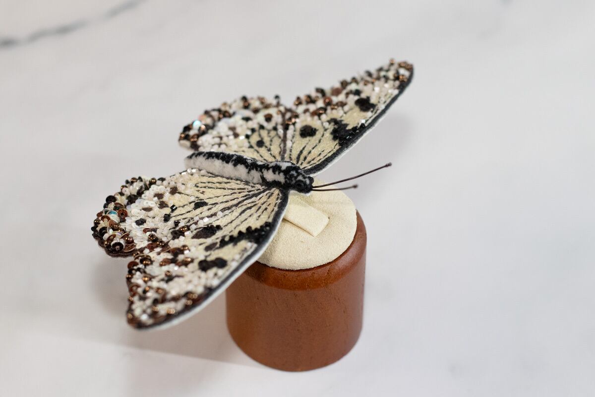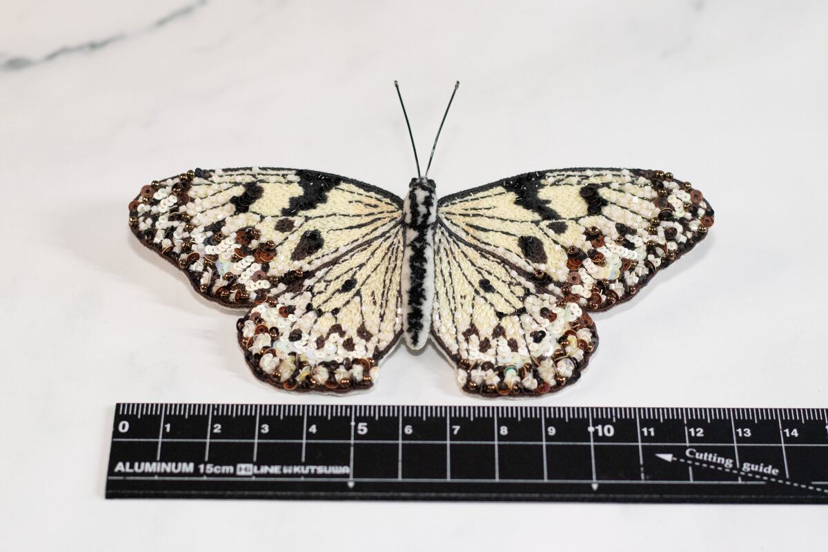 鱗粉を埋めるようにひと針ひと針丁寧に刺繡を施し、翅の縁にスパンコールとビーズをランダムに敷き詰めることで光を反射するようにしました。