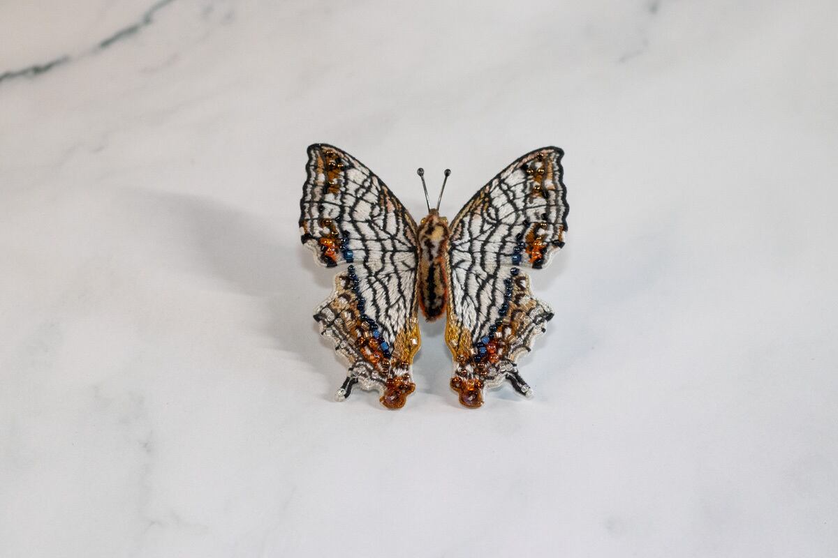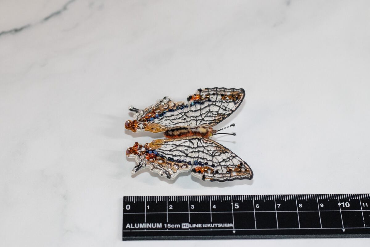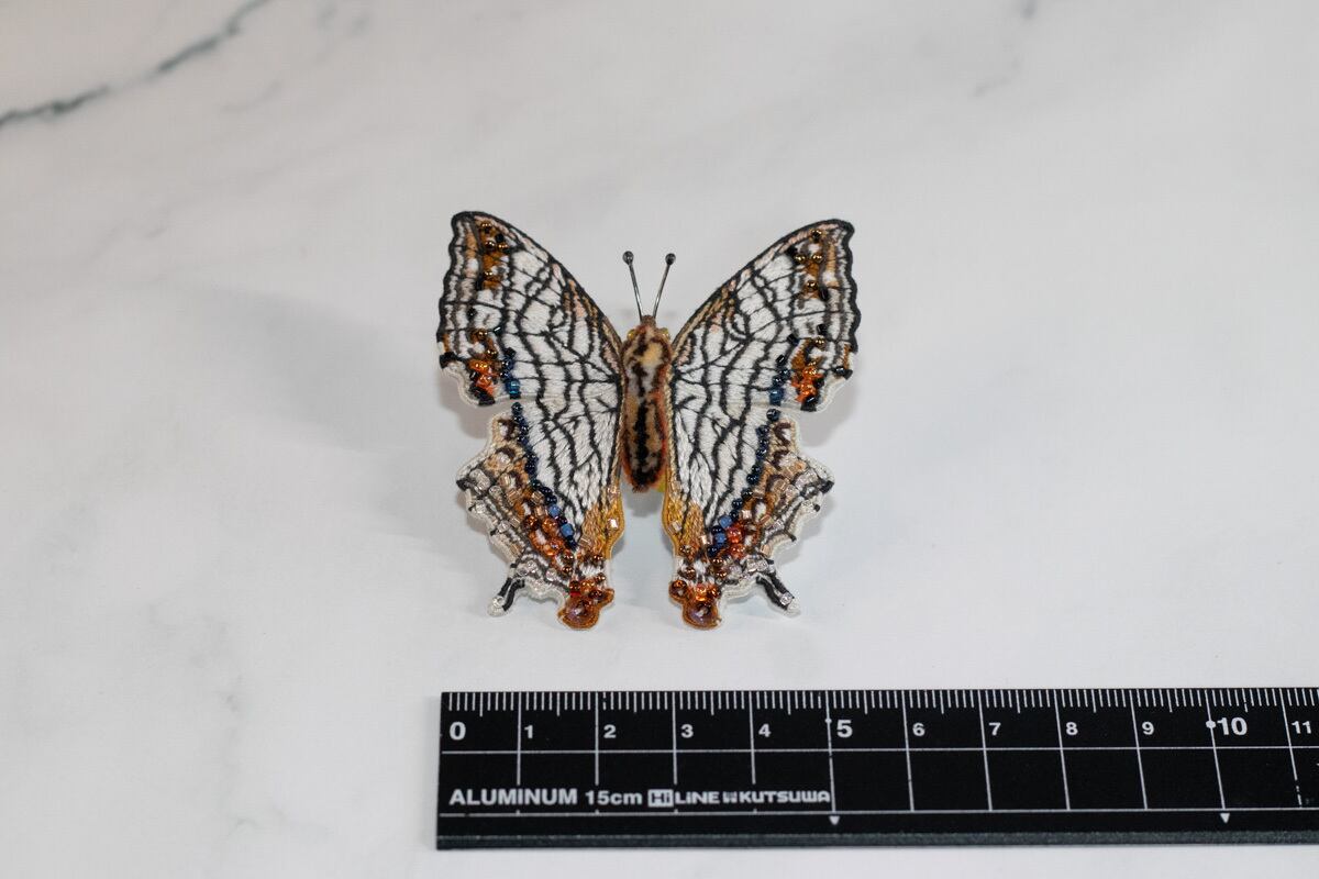 鱗粉を埋めるようにひと針ひと針丁寧に刺繡を施し、ビーズでアクセントをつけました。