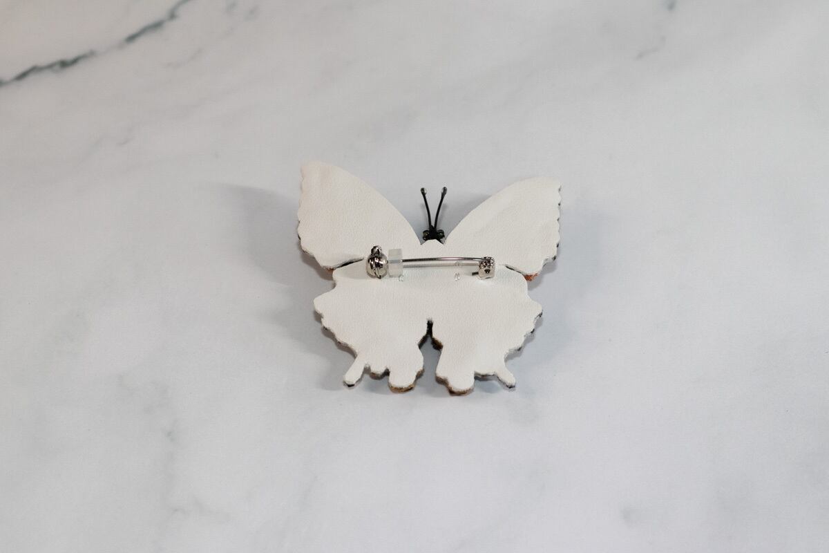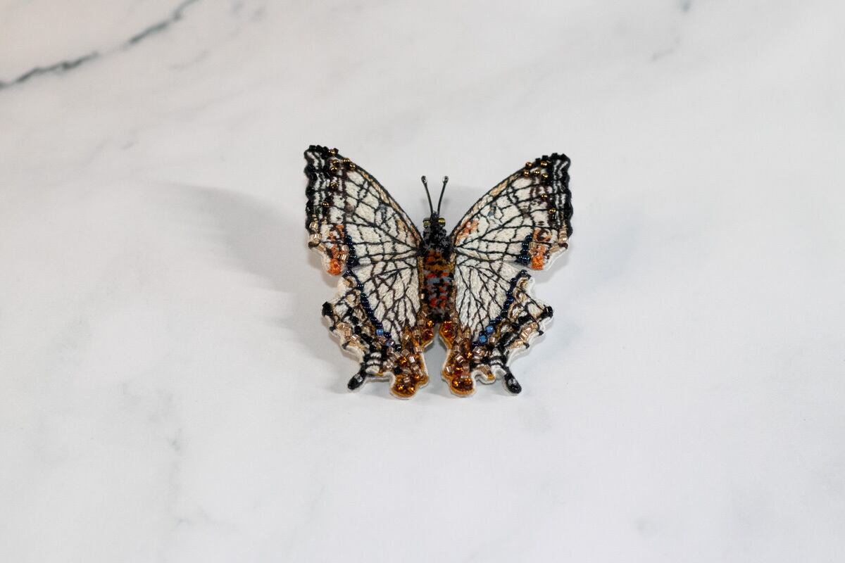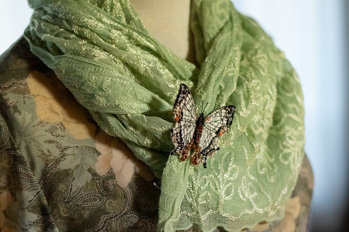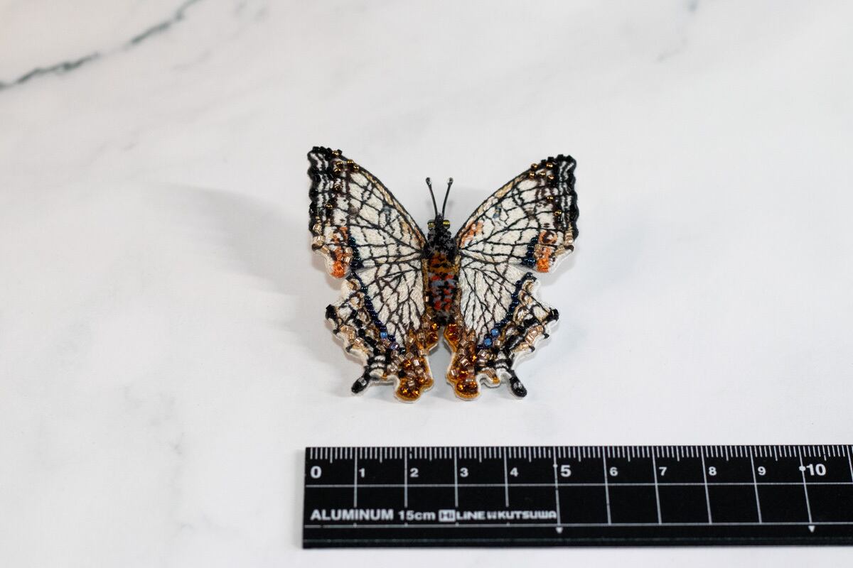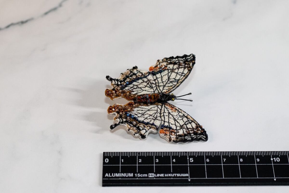 鱗粉を埋めるようにひと針ひと針丁寧に刺繡を施し、ビーズでアクセントをつけました。