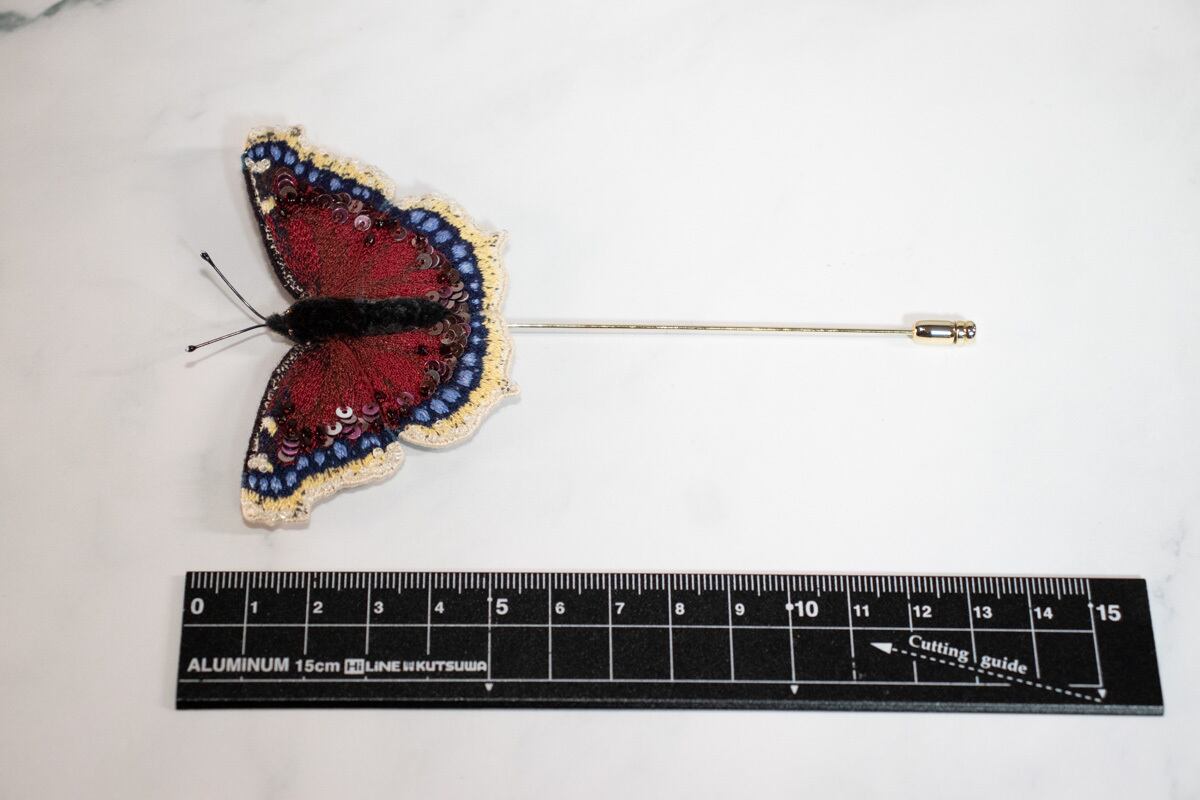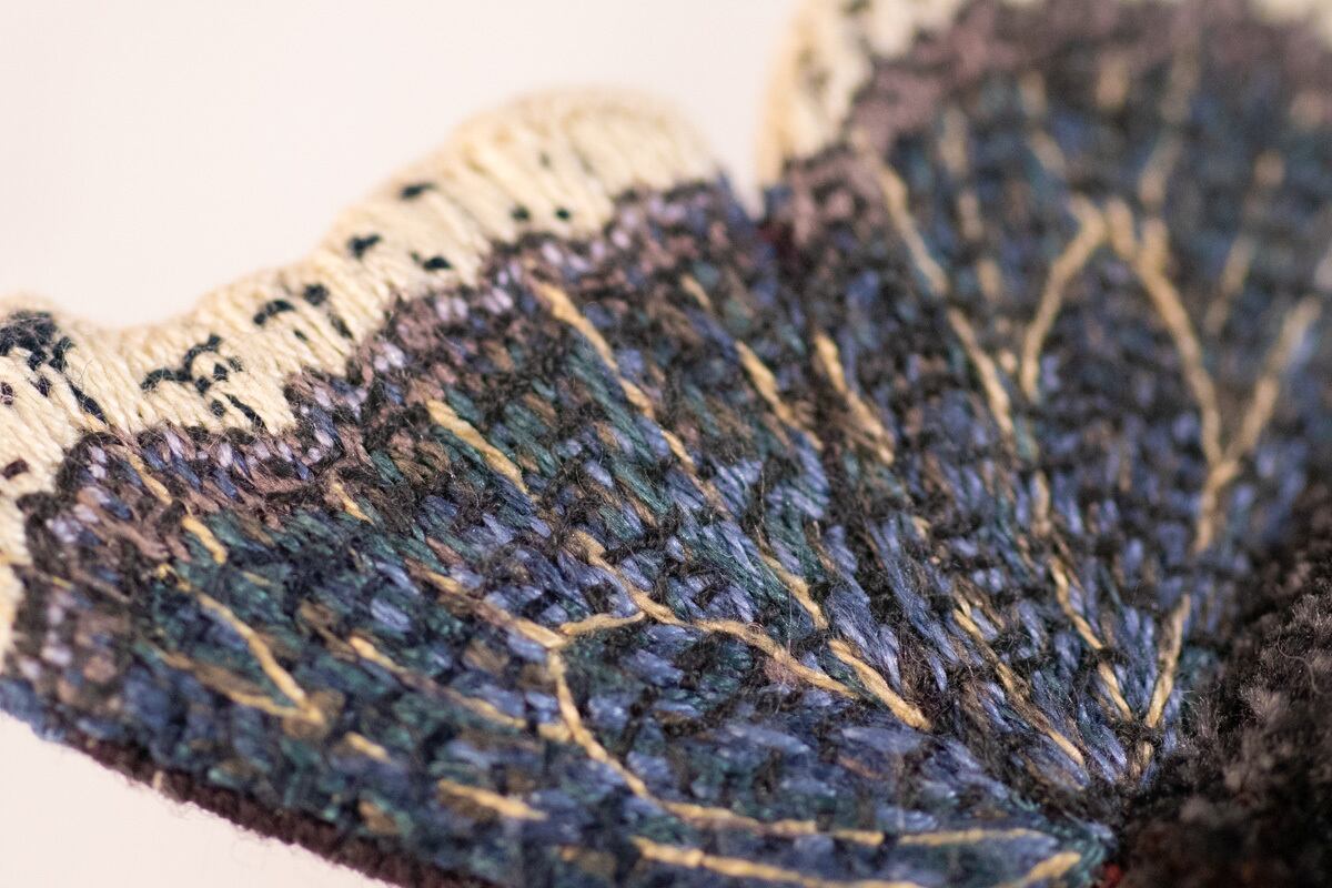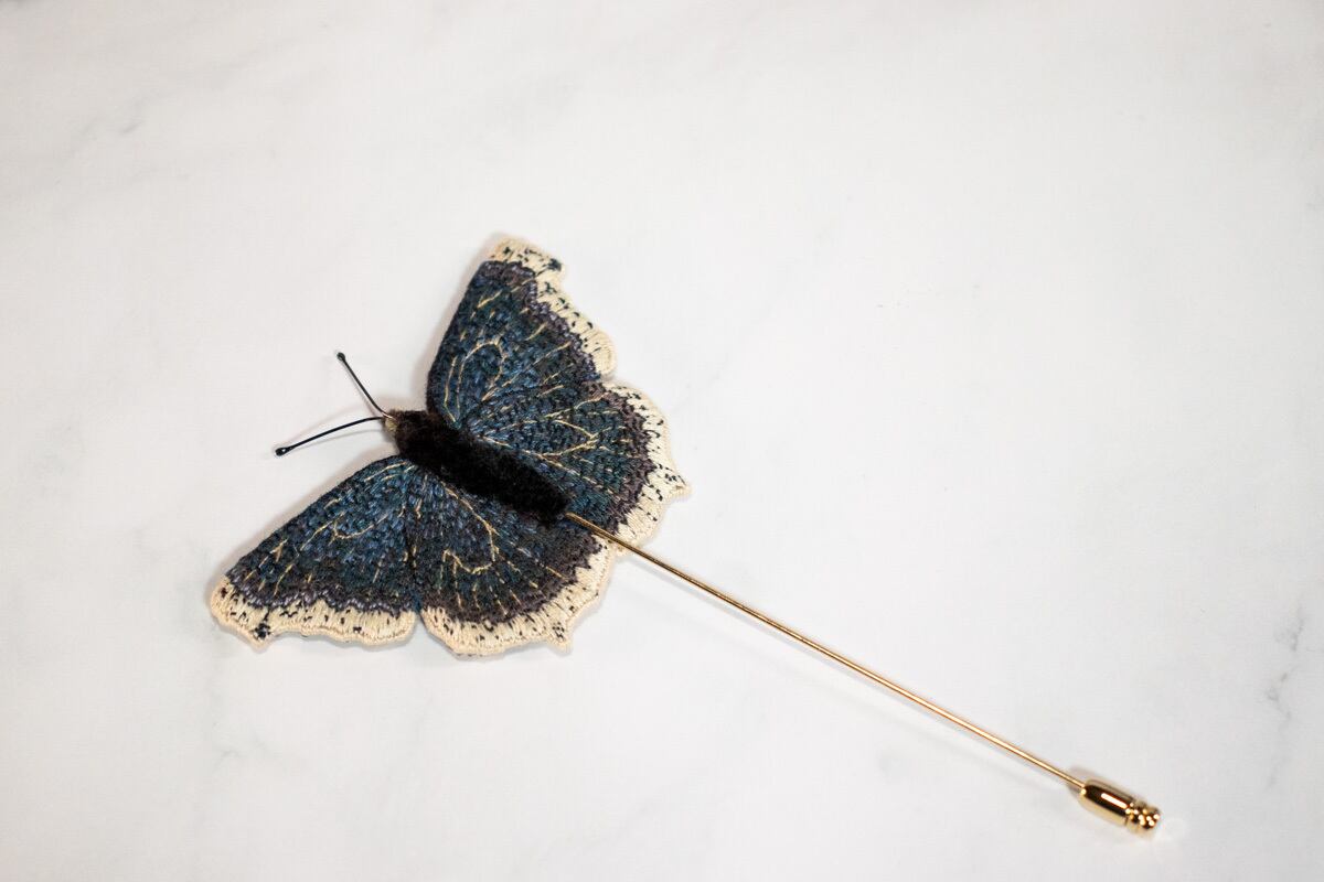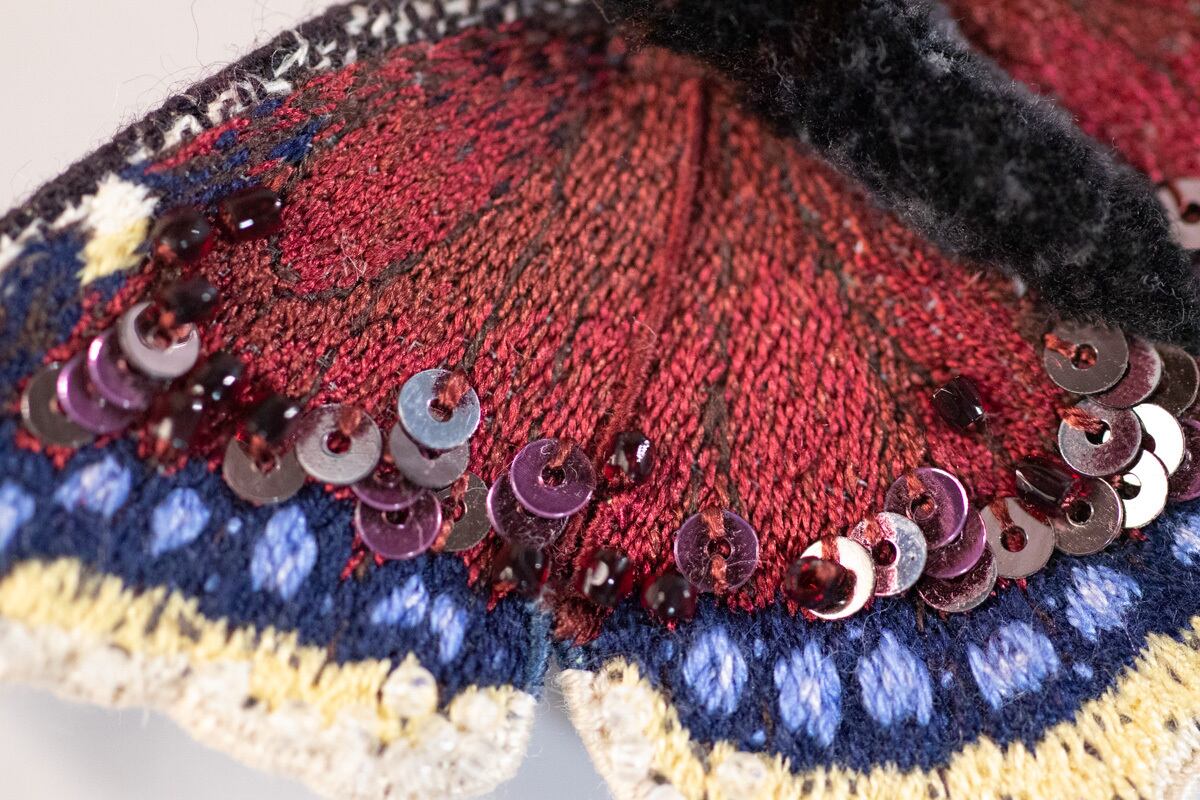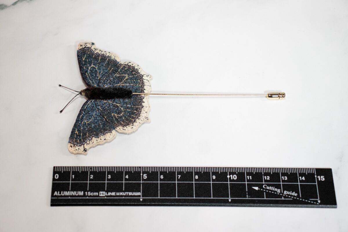 鱗粉を埋めるようにひと針ひと針丁寧に刺繡を施し、表はスパンコールでアクセントをつけました。